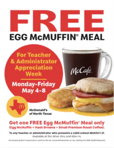 During Teacher Appreciation Week, May 4–8, 2026, stop by any participating McDonald’s locations to get a FREE Egg McMuffin Meal, just for educators. Follow McDonald’s of North Texas on social media for more information.