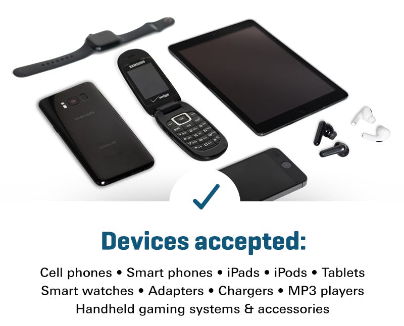 Our recycling partner, Eco-cell, accepts cell phones, smart phones, iPads, iPods, tablets, smart watches, adapters, chargers, mp3 players, handheld gaming systems, and related accessories such as charging cords and headphones.